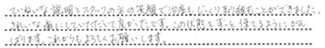 ていねいな説明とスタッフの方の笑顔で 治療もじっくり取り組むことができました。 きれいな歯にしていただいて良かったです。 この状態をずっと保てるようにがんばります。 これからもよろしくお願いします。