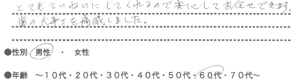 とてもていねいにしてくれるので安心してお任せできます。歯の大事さを痛感しました。
